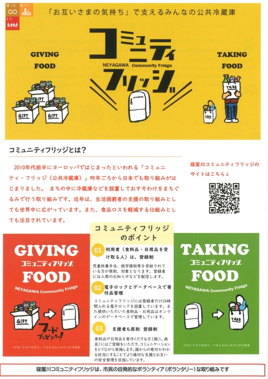 寝屋川コミュニティフリッジは、特定非営利活動法人寝屋川市民たすけあいの会が、2021年10月29日に開設した食料品・日用品の支援を必要とされる方(ひとり親家庭とそのこどもさんなど)が、時間や人目を気にせず、24時間都合が良い時に提供される食料品・日用品を取りに行ける仕組みです。