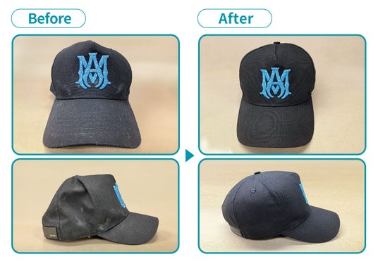 Before:汗や皮脂でくたびれた帽子 / After:汚れもスッキリ、シルエットも回復!