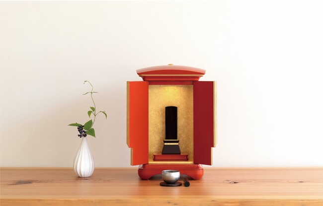 2001年にグッドデザイン賞(公益財団法人日本デザイン振興会/商品デザイン部門)を受賞した厨子「安壽(あんじゅ)」。大黒様の乗る俵をモチーフにした脚のフォルムと艶やかな洗朱が特徴的な、長年愛されるロングセラー商品です。