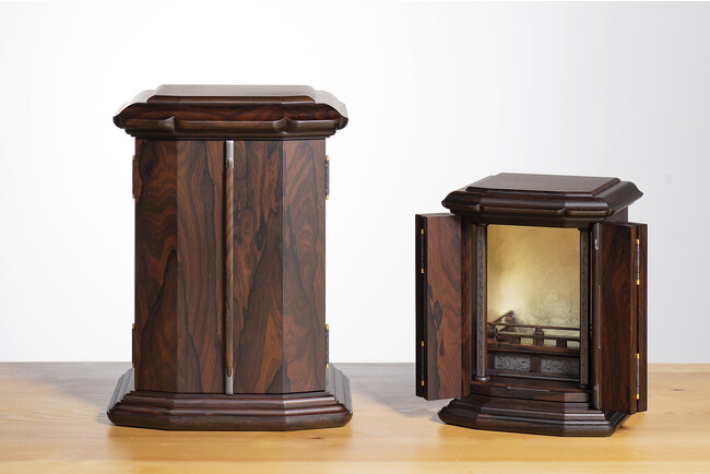 ギャラリー厨子屋設立当初にデザインした伝統的な厨子を再構築し、記念モデルとしてリバイバルしました。当時のきらびやかな装飾を落ち着いたデザインに変えつつ、家族の繁栄を願う更紗模様や吉祥紋様、子孫繁栄を意味する木瓜型の屋根などオリジナルの意匠は継承しました。欅の木目として希少な玉杢材を漆で仕上げたタイプと、高級家具や楽器材として使われるシャム柿の2タイプをご用意しました。また、位牌や仏像などを置ける大サイズと、自分だけの祈りの空間としてコンパクトに使える小サイズの2種類をご用意しています。