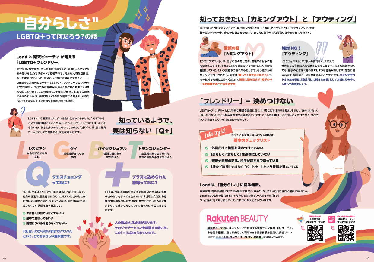 また、本特集では、美容サロン検索・予約サービス「Rakuten BEAUTY」(楽天グループ提供)の取り組みも紹介。多様性を尊重し、誰もが安心して利用できる美容体験の実現を目指し、美容サロン向けに「LGBTQ+フレンドリーサロンガイド(虎の巻)」を提供しています。