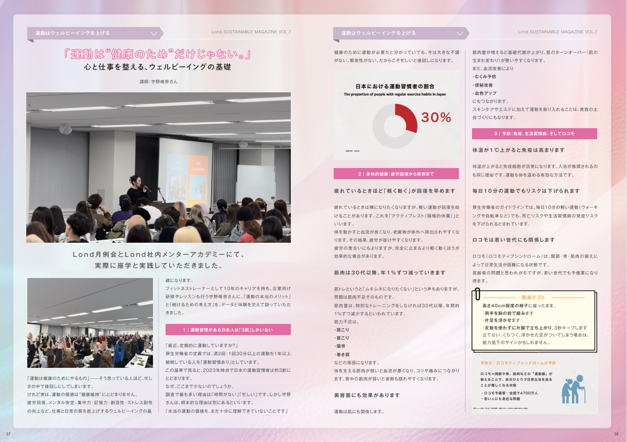 本誌は、Londヘアサロンの全セット面に設置され、施術中や待ち時間にお客さまが自由に手に取ることで、新しい価値観や社会とのつながりに触れるきっかけを創出しています。2026年度版となるvol.7では、「ウェルビーイング(Well-Being)」をテーマに、心身の健康や社会とのつながり、環境との共生といった観点から、これからの時代の豊かさを多角的に紹介しています。