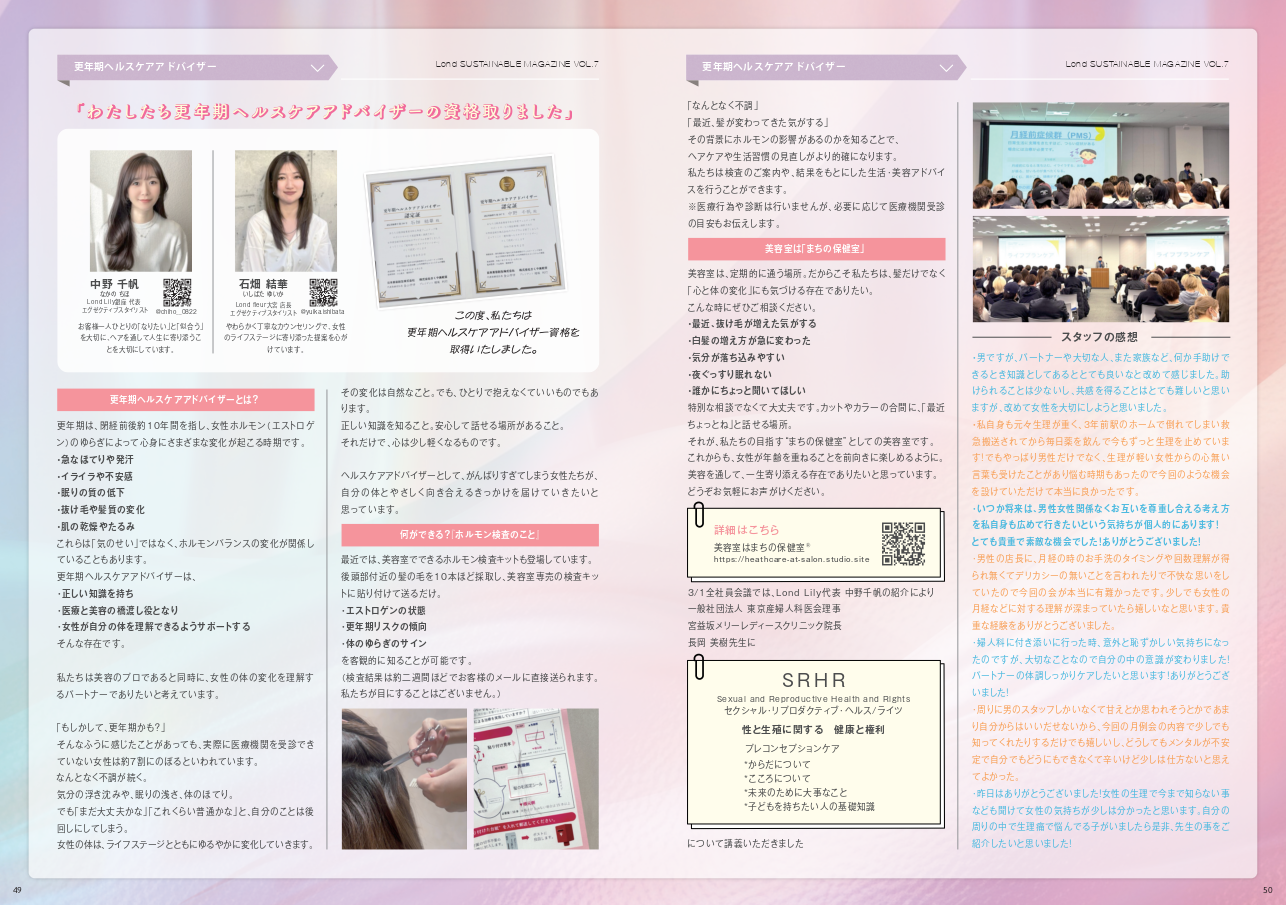 更年期に関する正しい知識を学び、日々の接客やコミュニケーションに活かすため、Londスタッフが更年期ヘルスケアアドバイザーの資格を取得しました。本誌では、年齢やライフステージの変化に寄り添う視点から、心身の変化への理解やサポートのあり方について紹介します。