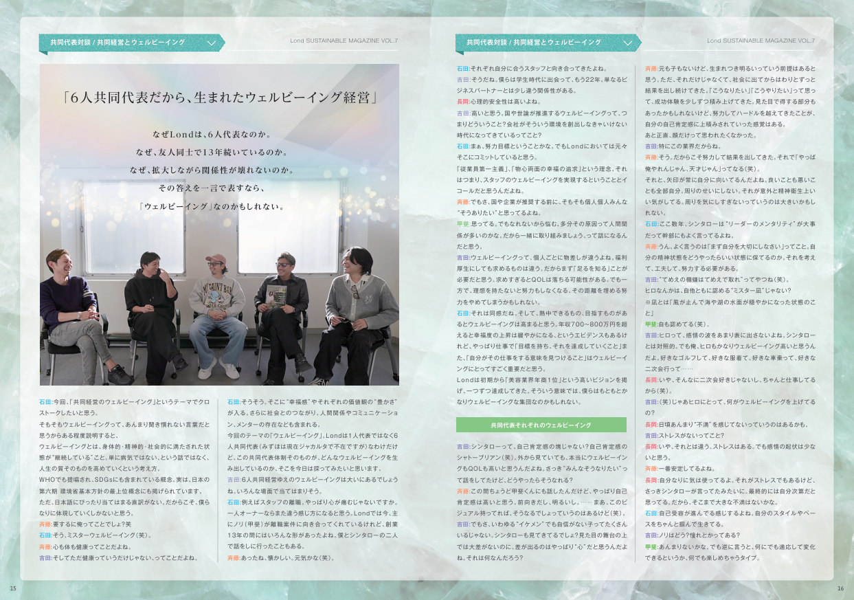 株式会社Lond Holdingsは、斉藤信太郎、吉田牧人、石田吉信、甲斐紀行、長岡宏晃、小林瑞歩の6名による共同代表体制を採用しています。本誌では、その体制から生まれる価値観を通じて、「働くこと」とウェルビーイングの関係性を描きます。