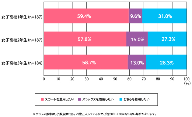 一方、「スラックスを着用したい」(女子高校1年生9.6%、女子高校2年生15.0%、女子高校3年生13.0%)、スカートとスラックスの「どちらも着たい」(女子高校1年生31.0%、女子高校2年生27.3%、女子高校3年生28.3%)という回答状況でした。