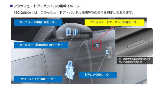 マブチモーター株式会社(本社:千葉県松戸市、代表取締役社長:高橋徹)は、フラッシュ・ドア・ハンドル、シンチング等に適した自動車電装機器用モーター「SC-266XA」を開発し、販売を開始いたしました。
