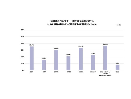 - 社内アンケート結果の共有範囲について尋ねたところ、36.5%の企業が「従業員へのアンケート/ヒアリングを実施していない、または状況を把握できていない」と回答。