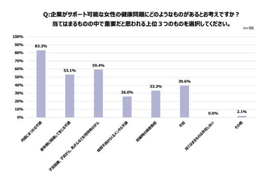 - 企業がサポート可能だと考える女性の健康問題の第1位は「月経にまつわる不調」(83.3%)。次いで「子宮筋腫、子宮がん、乳がんなど女性特有のがん」(59.4%)、「更年期に関連して生じる不調」(53.1%)。