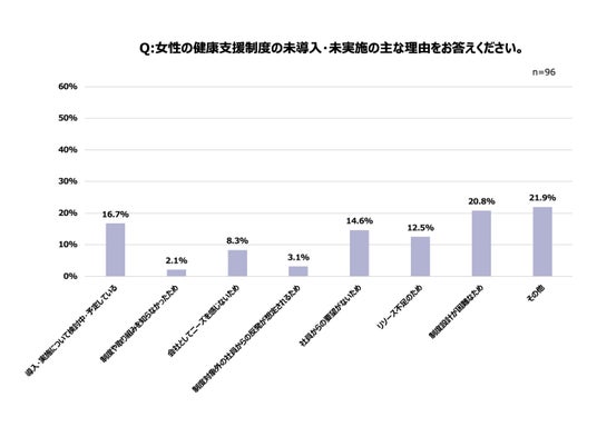 - 女性の健康支援制度が進まない最大の理由は「制度設計が困難なため」(20.8%)。次いで「社員からの要望がないため」(14.6%)、「リソース不足のため」(12.5%)。