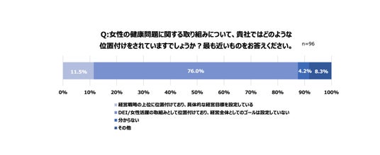 - 76.0%の企業が、女性の健康課題に関する取り組みを「DEI/女性活躍の取組みとして位置付けており、経営全体としてのゴールは設定していない」と回答。一方で、「経営戦略の上位に位置付けており、具体的な経営目標を設定している」と回答したのはわずか11.5%と、経営戦略として具体的な目標は設定していない企業が多いことが判明。