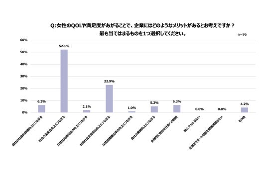- 女性の健康支援制度がもたらす影響として、企業が認識している主な効果として「社員の生産性向上につながる」(52.1%)が最多。次いで「女性社員定着率の向上につながる」(22.9%)、「会社の社会的評価向上につながる」(6.3%)「多様性に寛容な社風への刷新」(6.3%)。