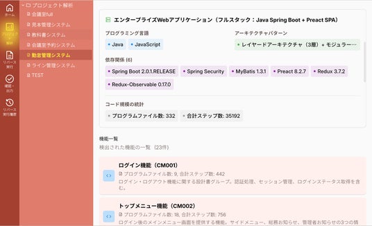 プロジェクトフォルダを指定するだけで全コードを自動解析。CRUD図を含むシステム全概要を数時間で生成。