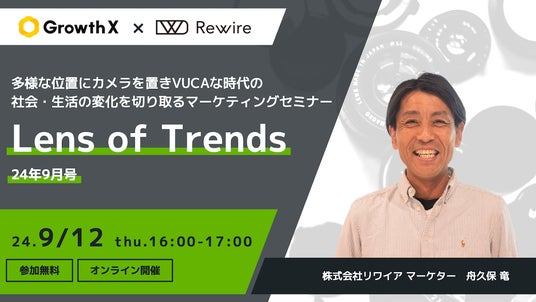 株式会社リワイア(所在地:東京都港区、代表取締役:加藤 英也)は、株式会社グロースX(本社所在地:東京都渋谷区、代表取締役:津下本 耕太郎)と、2024年9月12日(木)にOSINTとPEST分析を通して気づきを得たトレンドを発表するマーケティングセミナー「Lens of Trends:24年9月号」を開催します。本セミナーはご覧いただいたみなさまに、トレンドを背景に少し先の社会を考え、マーケティングに投影いただくことを目的としています。毎月連続で開催し、月次のトピックをお伝えしています。
