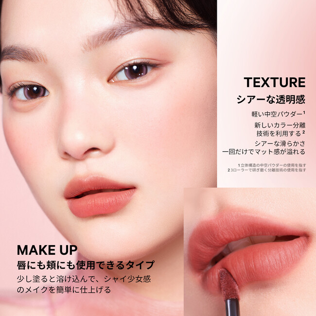 【繊細でやわらかな質感】ベルベットマットのテクスチャー、軽い中空パウダーを使用し、エアリーな軽さを実現する。テクスチャーは繊細で柔らかい、塗りやすく、ひと塗りで仕上がります。