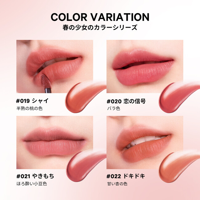 Perfect Diaryのリップティント片思いシリーズのカラーは少女感あふれる色味が特徴で、4つのタイプがあります。