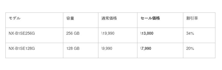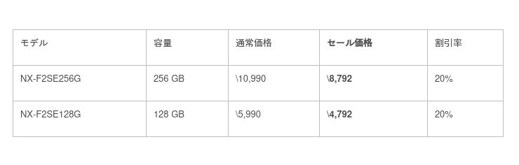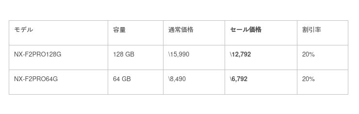 また、SDカードでの動画撮影を行うお客様にむけて、規格値上限に迫る転送速度を持ち、V90対応のSDXC UHS-II メモリーカードNX-F2PROと、V60に対応したNX-F2SEシリーズもセール対象といたしました。