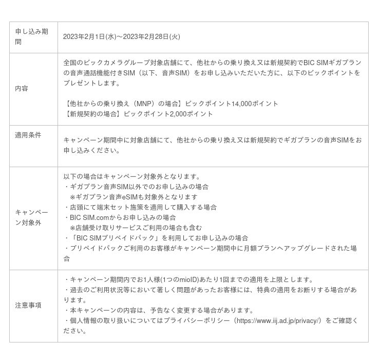 ビックカメラグループの格安SIMである「BIC SIM」は、全国のビックカメラグループ対象店舗にてお申し込みの方限定でビックポイントを最大14,000ポイントプレゼントするお得なキャンペーンを実施します。