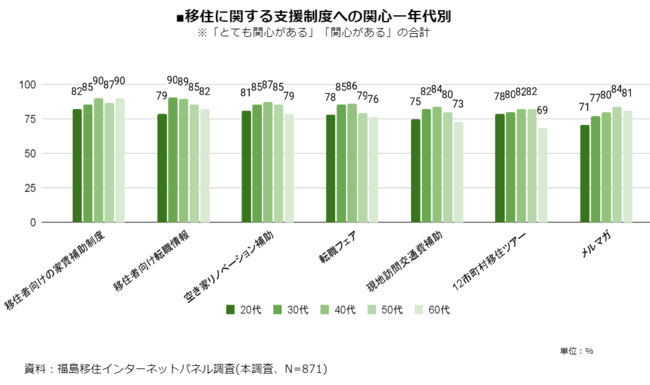 ■ 移住決定に向けた支援は、住まい、仕事などに8割が関心。概ね40代が最も関心が強く、転職サポートについては30代の関心が強い