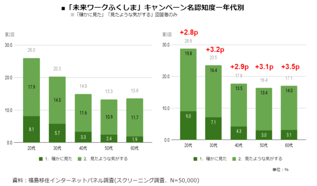 センターが実施する「未来ワークふくしま」キャンペーンについて、「確かに見た」または「見たような気がする」と答えた方の割合は、全世代で 2~3ポイント上昇しました。特に、20代が28.8%、30代が23.5%と高い傾向にあります。センターでは、引き続き、20~30代向けの移住施策の浸透を図っていきます。