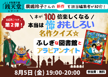 銭天堂シリーズ・廣嶋玲子先生の最新作『ふしぎな図書館とアラビアンナイト』を紹介しながら、モチーフとなった「アラビアンナイト」のクイズを大出題。クイズを解きながら、名作の秘密を知ることができます。真夏の夜に、家族みんなでチャレンジ!