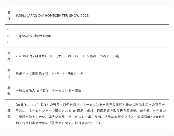 セメダイン株式会社(本社:東京都品川区、代表取締役会長兼社長:水澤伸治)は、2023年8月24日(木)から幕張メッセ国際展示場で開催される「第59回 JAPAN DIY HOMECENTER SHOW 2023」に出展します。
