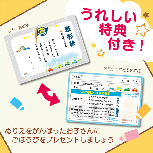 塗り絵を塗り終えた、お子様へのごほうびとして、「子ども免許証」と「表彰状」を特典に付けています。子ども免許証には、信号を守ることや横断歩道を渡る際の左右確認など交通ルールの「おやくそく」を記載。お子様がなくしたりしないよう、しっかりとした紙質のはがきサイズで作成しています。