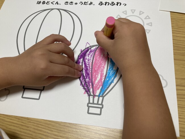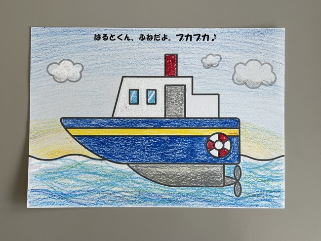 「〇〇くん、ひこうきだよ。ビューン!」など、塗り絵用紙すべてにお子様の名前とともに、「ブーン」「ドサーン」など乗り物の動く音を記載しています。言葉の意味がまだよく分からない幼児も、音やリズムから少しずつ言葉を覚え、感性が養われます。塗り絵を終えた後は、読み聞かせを通じて、親子のコミュニケーションを深められます。