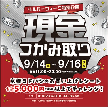 京都ヨドバシで9/7(土)~9/16(月・祝)の期間中にお買い上げいただいた合計5,000円(税込)以上の対象レシートを9/14(土)~9/16(月・祝)にイベント会場へお持ちいただくと現金つかみ取りイベントに参加いただけます。