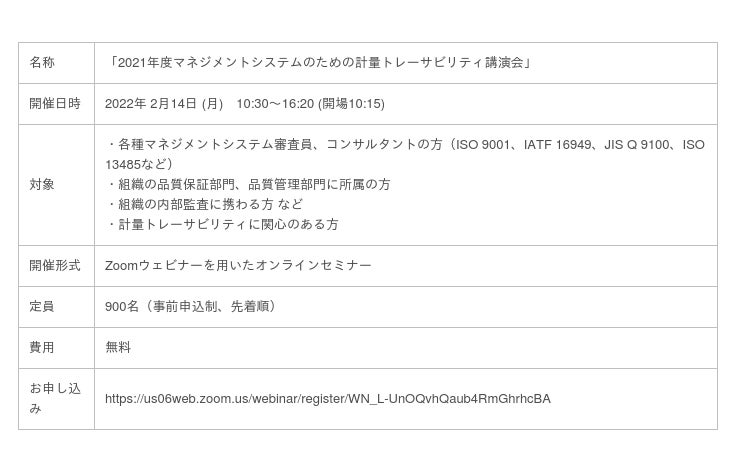 この度、NITE、公益財団法人日本適合性認定協会(JAB)、および一般財団法人日本品質保証機構(JQA)計量計測部門は、来る2022年2月14日 (月)、「2021年度マネジメントシステムのための計量トレーサビリティ講演会」(Zoomによるライブ配信、聴講無料、事前申込制)を開催することになりました。