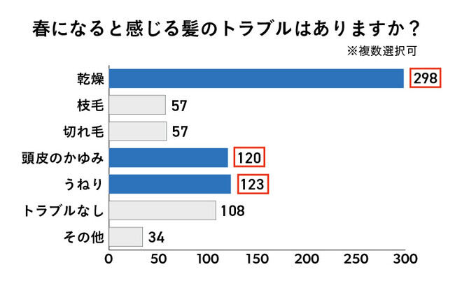 500名のうち108人は春に髪トラブルを感じないと返答しており、その一方で約400名の方が春になると感じる髪のお悩みがあるということです。