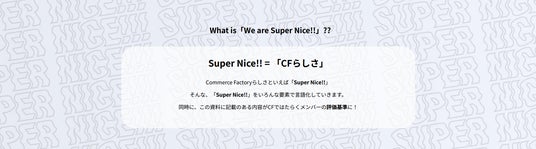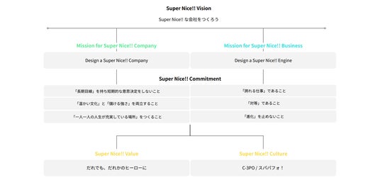 『We are Super Nice!!』では、コマースファクトリーとして実現したいことをVisionとして掲げて、Visionを実現するための要素として「会社づくり」「事業づくり」の2つのMissionを策定しております。各Missionには、Commitmentという「約束ごと」を策定し、Missionを支える要素として「Value」と「Culture」を策定しました。