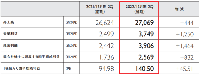 売上高27,069百万円(前年同期比444百万円増)、営業利益3,749百万円(同1,250百万円増)、経常利益3,906百万円(同1,464百万円増)、親会社株主に帰属する四半期純利益2,569百万円(同832百万円増)となり、売上高、営業利益、経常利益、四半期純利益のすべてにおいて、2021年12月期第2四半期連結決算を上回る結果となりました。