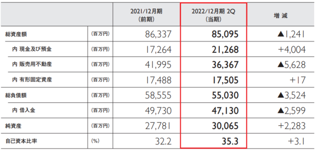 この結果は主に、地主プライベートリート投資法人及び大手リース会社をはじめとして順調に案件売却が進み、販売用不動産が減少したこと、短期及び長期の借入金が減少したこと等によるものです。