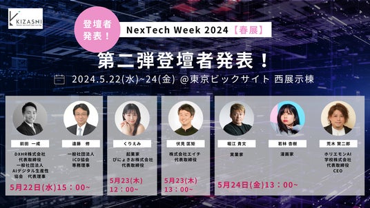 株式会社KIZASHI(所在地:東京都渋谷区、代表取締役:菅野 哲也、以下:KIZASHI)は、2024年5月22日(水)~24日(金)に東京ビッグサイトで開催される人、企業、世界の「未来」を変革するソリューションとの出会いの場「NexTech Week 2024」にて、生成AI時代のリスキリングをテーマに、会場内で最大規模のブースを出展いたします。そのブース内の特設ステージにおいて実施するトークセッション・講演の登壇者第2弾をお知らせいたします。