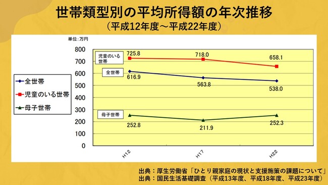 日本において「収入を増やしづらい環境にある」代表が、シングルマザーで、厚生労働省によるとシングルマザーの平均収入は約252万円で、全世帯の平均収入の約1/2です。