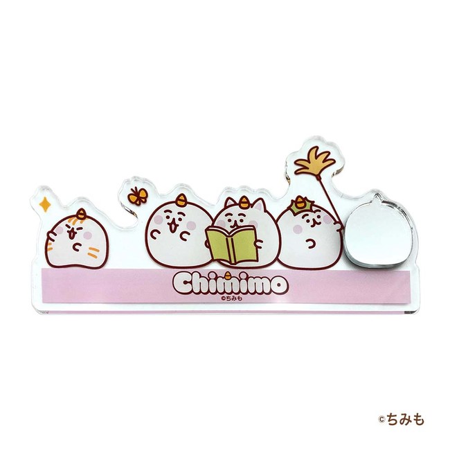 今回のラインアップは、3連アクリルキーホルダー、吸水コースター、キャラメモボード、ステンレスタンブラーです。パステルピンクの背景に「ちみも」たちが楽しく過ごしているデザインは、とっても癒されます!