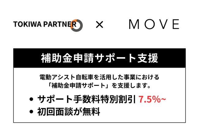 MOVE株式会社(本社: 東京都中野区 代表取締役: 冨田 大揮)と中小企業資金調達支援・経営アドバイザリーサービスの"Tokiwa Partner"が、電動アシスト自転車に関連した新規事業において、中小企業のお客様への事業拡大と成長を支援するため、補助金申請サポートに関する業務提携を発表しました。この提携により、MOVE.eBikeの導入を検討している事業者は、公的補助金を活用することで、これまでより少ない資金で新規事業へ参入できるようになります。また、MOVE.eBike × Tokiwa Partner の補助金申請サポートでは、サポート手数料の特別割引(サポート手数料 7.5%~ ※初回面談は無料)が適用されるため、他社基準でも大変お得にご利用が可能です。(本件の問い合わせ先: info@x-move.jp)