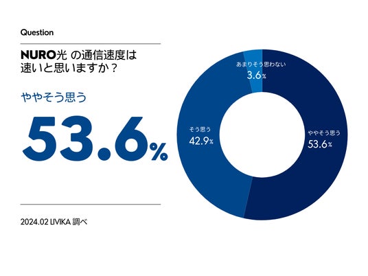 NURO光の通信速度に関する質問に対して、53.6%の方が「ややそう思う」、42.9%の方が「そう思う」と回答されました。一方で、「あまりそう思わない」と答えた方は3.6%にとどまり、NURO光の利用者の大部分が高速な回線速度に対して快適さを感じていることが伺えます。