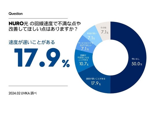 NURO光に関する不満や改善の要望において、半数は「不満はない」と回答する一方で、「速度が遅い」(17.9%)や「回線が不安定になることがある」(10.7%)などの回答もありました。ご自宅の環境や利用時間帯によっては、回線が不安定になることもあるようです。また、「サービスエリアを増やしてほしい」(7.1%)や「料金が高い」(7.1%)などの意見も寄せられました。
