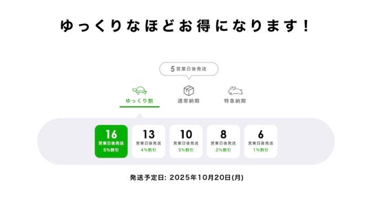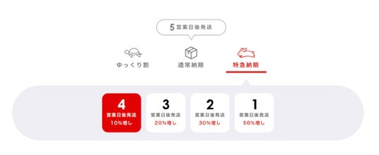 選択する納期が「ゆっくり」なほど、割引率が高くなりお得になります。これまで通常と特急の2段階だった納期を細かく選択できるようにしました。