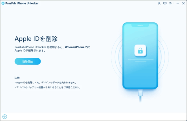 1、まずはPassFab iPhone Unlockerをインストールして起動します。Apple IDのリセットが目的なので、左下の「Apple IDを削除」を選択します。