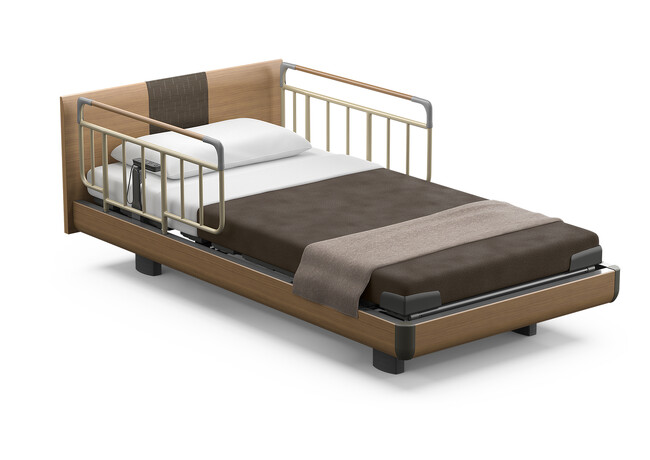 「INTIME1000」シリーズは、背を上げて読書をする、膝を上げて足をリラックスさせるなどの機能を備えた一般家庭向け電動ベッドです。介護が必要になった際には手すりなどの介護用オプションの取り付けが可能です。