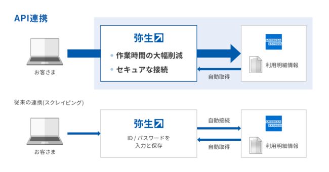 今回のAPI連携により、アメリカン・エキスプレスの提供するビジネス・カードと弥生の会計ソフトウエアをご利用のお客さまは、カードの明細情報を、安全かつ安定的に弥生会計に取り込み、各種会計処理を自動的に行えるようになります。