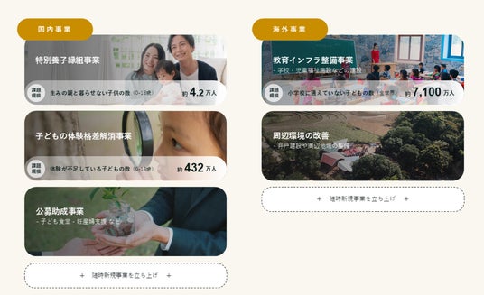 ミダス財団は「2050年までに1億人にポジティブな人生選択の機会を提供する」ことを目標に、年次ベースで新たな社会課題解決事業の立ち上げに挑戦していきます。そして、取り組み始めた事業は原則として継続的に運営していくことを約束しています。