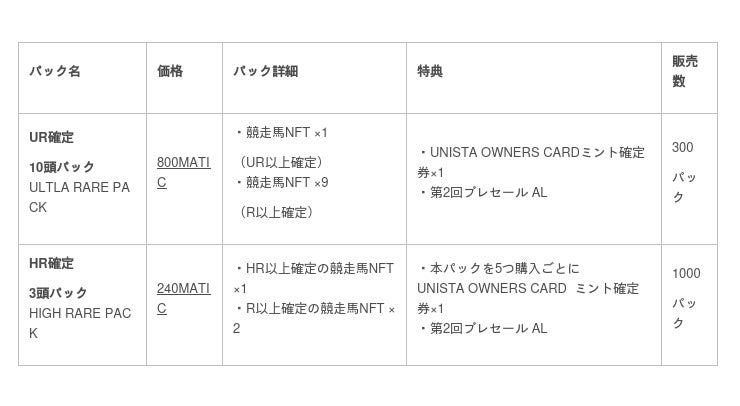 各販売パックの価格は下記のとおりです。暗号資産MATICの価格が前回発表時より大きく変動しておりますが、当初予定の価格を据え置きで販売することといたします。