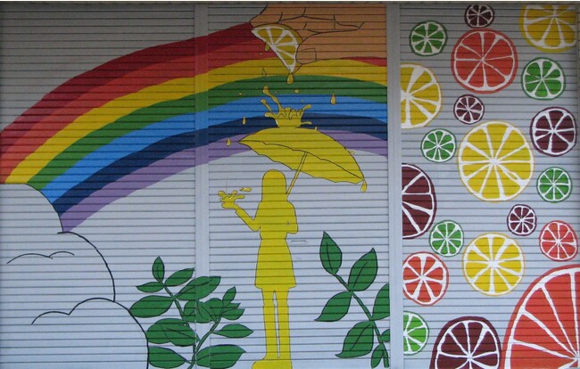 今回は、JR磐田駅前のビタミンロード栄町商店街の空き店舗のシャッター2カ所に、磐田農業高校美術部の生徒たちがそれぞれシャッターアートを行いました。