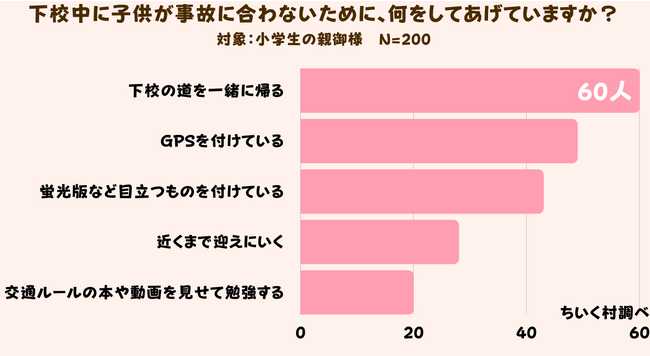 下校中に子供が事故に合わないために、小学生の親御様が何をしてあげているか調査したところ、200人中60名が「最初のうちは一緒に帰ってあげる」と回答していました。
