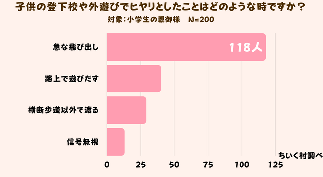 子供の登下校や外遊びでヒヤリとしたことを調査した結果200人中118人が「急な飛び出し」と回答していました。