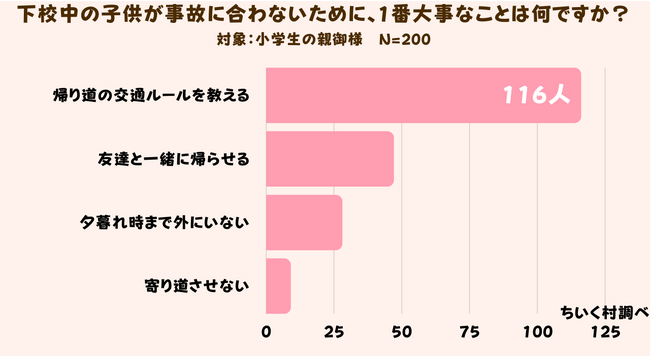 小学生の親御様が考える「下校中に子供が事故に合わないために1番大事なこと」は何か調査したところ、200人中116名が「学校からの帰り道の交通ルールを具体的に教えること」と回答していました。