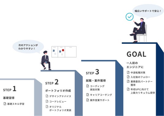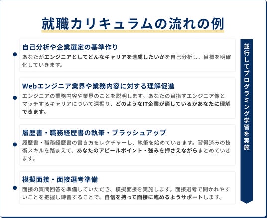 Webエンジニア就職に向けて、企業選定基準作り、履歴書・職歴書添削、面接ロープレなどを一貫してサポートします。